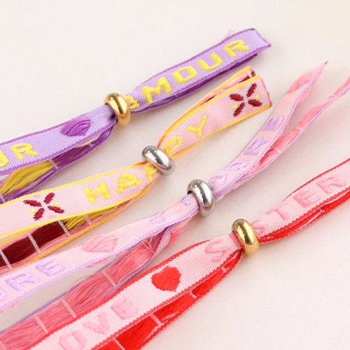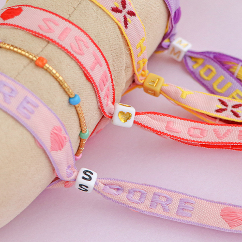 Utiliza esta bonita cinta con texto para crear pulseras para cerrar con, por ejemplo, un abalorios de cierre deslizante o una cuenta de letras acrílicas con un gran orificio de enfilado. También se pueden hacer bellas pulseras con diversos abalorios que puedes llevar junto con las pulseras de cinta. Enfila coloridas cuentas de vidrio rocallas en un hilo elástico o haz una pulsera en la que alternes perlas de agua dulce con cuentas de vidrio rocallas, abalorios smiley y una cadena jasseron.