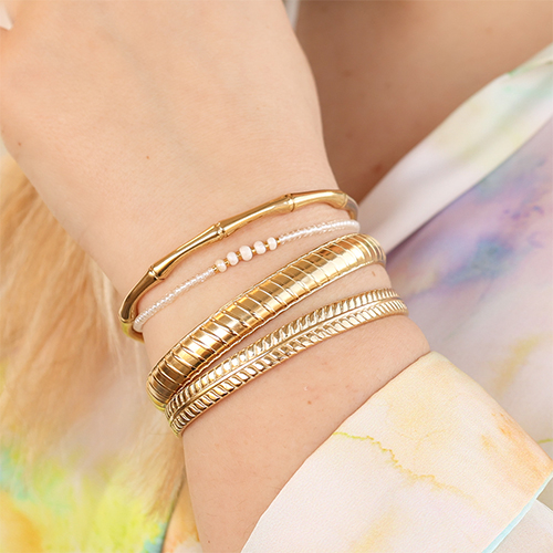 Cuando combinas esta serie de pulseras de acero inoxidable con coloridas pulseras hechas en casa, ¡las pulseras de acero inoxidable destacan aún más! Por ejemplo, enfila rocallas Preciosa blancas y perlas de agua dulce en hilo elástico para una pulsera minimalista, o utiliza cinta con flores que cierras con un elegante cierre de abalorio deslizante. También puedes hacer una pulsera con alambre metálico alternando cuentas de piedra natural con diferentes abalorios metálicos DQ. Por último, ¡no olvides utilizar una cadena de extensión!