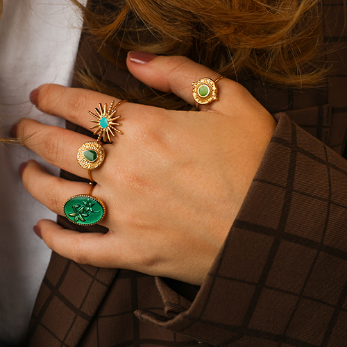 Anillos Acero Inox esmalte redondos con gota Dorado-verde oscuro