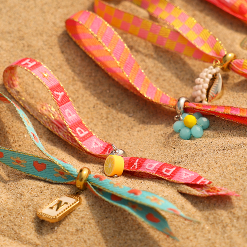 Esta nueva colección de cintas con texto, creada por nuestro equipo interno, incluye alegres textos como happy, ocean child y good vibes o con divertidos estampados como flores y corazones. Con esta colección podrás crear tobilleras, cordones para gafas de sol y pulseras de lo más monas.