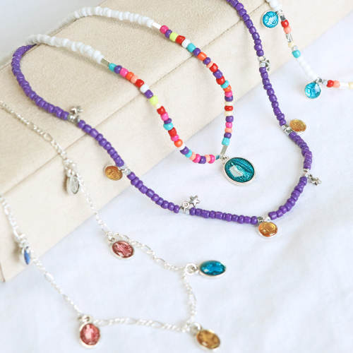 ¿Buscas inspiración para crear preciosos collares en capas? Echa un vistazo a esta colección de colgantes metálicos DQ con epoxi. Crea una gran variedad de collares ensartando, por ejemplo, cuentas rocallas en diferentes colores y montando un colgante en medio de las cuentas con ayuda de una anilla. También puedes utilizar varios colgantes a lo largo del collar. Cuando se trabaja con minicuentas, se recomienda utilizar un tapete para las cuentas. Para enhebrar las cuentas más rápidamente, también puedes utilizar un cargador de abalorios Spin-N-Bed. Utiliza un hilo de nylon y un protector de hilo antes de colocar el cierre para protegerlo. Para hacer un collar de cadena Jasseron con colgantes es muy fácil, y los dijes quedan muy bien. Termina los collares con un bonito cierre y coloca una cadena de extensión para ajustar la longitud.