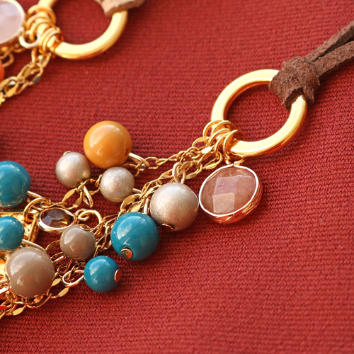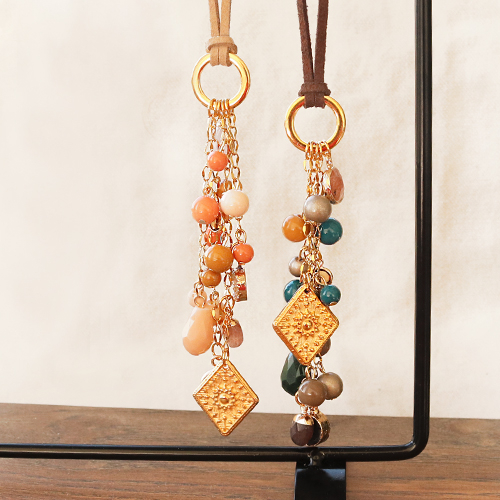 Con ayuda de los abalorios de cristal hemos apostado por la creación de un romántico collar bohemio largo y un par de pendientes a juego ¡seguro te van a encantar!. Para esto hemos utilizado antelina, un anillo cerrado metálico DQ. Aquí se cuelgan por medio de una cadena jasseron todo tipo de abalorios de cristal y otros elementos, como colgantes de cristal o abalorios faceteados gota. Y con este mismo concepto crea un precioso par de pendientes a juego.