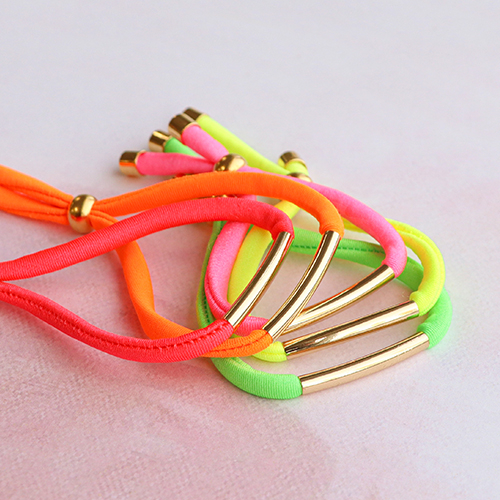 Con esta colección de cinta elástica Ibiza puedes confeccionar rápidamente una colorida pulsera. Utiliza los abalorios metálicos DQ para cerrar las pulseras y las terminales para un bonito acabado. A continuación, cuelga tu colgante favorito en la pulsera con, por ejemplo, una borla de un color alegre. Combina las pulseras con los brazaletes que haces con los abalorios Preciosa en colores.