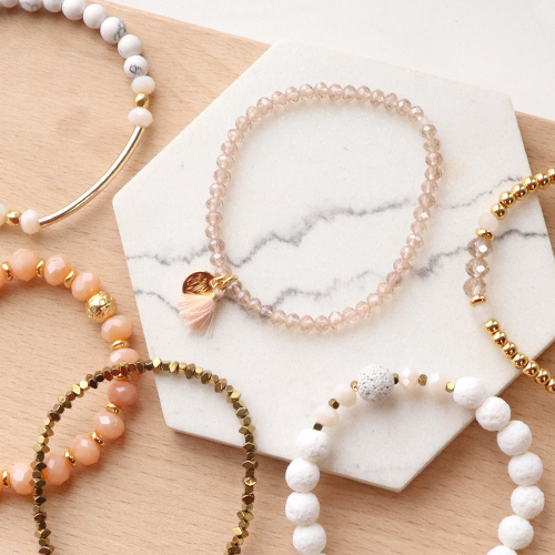 ¡Con las nuevas cuentas faceteadas puedes hacer todo tipo de joyas posibles e imaginables en tus colores favoritos! Para este juego de inspiración, hemos hecho pulseras con cuentas faceteadas y de otros tipos. Para crearlas, enhebra las cuentas facetadas en un hilo elástico. Puedes variar con abalorios y cuentas metálicas DQ para conseguir un efecto animado. Después de ensartar una bonita combinación de abalorios en el hilo elástico, cierra la pulsera haciendo un nudo y asegurándolo con pegamento instantáneo. Otra idea es la combinación de las cuentas facetadas, entrepiezas y los colgantes de piedra natural que también son un complemento perfecto para joyería de tendencia. Lleva preciosas pulseras de abalorios faceteados junto con pulseras de hematita y cuentas de lava katsuki. Ahora es tu turno, ¡disfruta!