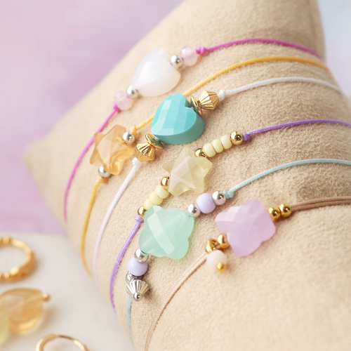 Las bonitas formas de los nuevos abalorios faceteados fashion son ideales para hacer joyas de moda. Para las pulseras puedes decidir utilizar varios colores de moda de la misma gama. Coloca un abalorio faceteado fashion en el centro del hilo macramé. A continuación, ensarte en el hilo una combinación de cuentas rocallas Preciosa y abalorios metálicos DQ. Para un look aún más brillante, puedes añadir pequeñas cuentas facetadas a la joya. Sujeta la pulsera con la técnica del nudo corredizo. En esta ocasión, elige un hilo macramé del mismo color que la abalorio faceteado fashion para crear un contraste vivo. Completa el look de moda haciendo pendientes con los abalorios faceteados fashion, bastones metálicos y fornituras para pendiente metálicas DQ. Diviértete creando joyas imprescindibles en los colores de tendencia más bonitos.