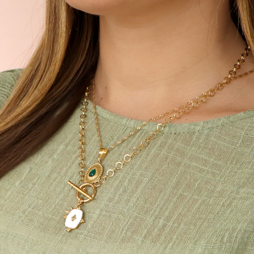 Este set de inspiración te muestra cómo puedes diseñar una bonita bisutería con muy pocos materiales. Para esto, elige una cadena jasseron y un bonito candado, como un cierre en forma de T, y fija los colgantes de acero inoxidable con una anilla a la cadena. Así podrás crear fácilmente un bonito collar o pulsera. Para crear pendientes a juego, utiliza tus fornituras para pendientes favoritas en combinación con uno de los colgantes de acero inoxidable.
