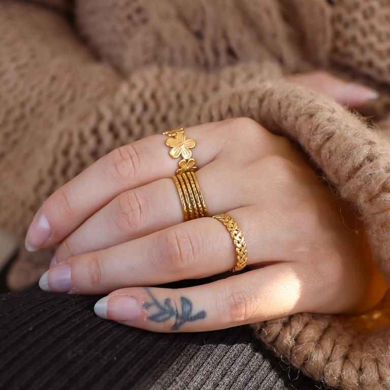 Los anillos ya hechos siempre vienen bien en tu colección. Esta nueva serie consta de anillos de acero inoxidable con distintos diseños, como anillos dobles, anillos de flores y anillos trenzados.¡Preséntalos a tus clientes junto con los anillos hechos por ti!