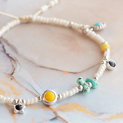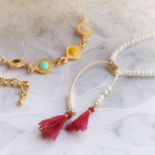 ¿Estás lista para hacer joyería colorida? A continuación, ponte a trabajar con los abalorios, los colgantes y las entrepiezas metálicas DQ. Con estos magníficos artículos podrás diseñar las pulseras, collares y tobilleras ¡más vibrantes! Por ejemplo, puedes hacer un collar uniendo las entrepiezas metálicas DQ con anillas. Conecta un mosquetón a una extensión de cadena a cada lado y ¡ya lo tienes! ¡Tus joyas están listas! A continuación, crea tobilleras y pulseras de colores. Combina abalorios y colgantes de metal DQ con cuentas Miyuki, chips de piedra natural y cuentas Millefiori. Enhebra todos los elementos en el hilo macramé y cierre con un nudo square knot. Monta unas borlas de colores en el extremo del hilo para completar la joya. Ahora es tu turno, ¡diviértete!