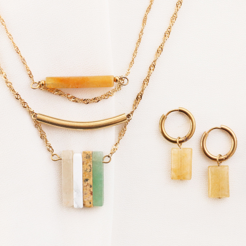 ¡Hacer joyas con estilo nunca ha sido tan fácil!. Con la nueva colección de piedras semipreciosas podrás crear infinidad de preciosos diseños. Con ayuda de la línea de fornituras pendiente base podrás crear fácilmente sofisticados pendientes. Simplemente pega la cuentas con pegamento en un pendiente base plana o enfila la piedra en un bastón metálico. También con este bastón metálico podrás crear un colgante, el cual podrás montar a un pendiente criolla o en una cadena jasseron. Para completar el juego haz un collar en varias capas con la cadena jasseron. Las piedras se pueden unir a la cadena con un bastón metálico. ¡Buena suerte!