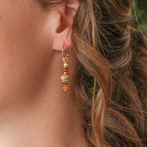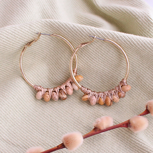 ¿Buscas inspiración para tu colección de pendientes? Utiliza estas piedras naturales. Por ejemplo, elige unos pendientes aro, ensarta las cuentas rondeles en el alambre artístico y envuélvelo alrededor del pendiente de aro, poniendo siempre un rondel en el exterior. También puedes hacer un par de pendientes tú misma con el alambre metálico y ensartar una combinación de cuentas en el alambre. Crea una anilla en la parte superior para sujetar el pendiente a una fornitura de base. Haz tus propios ear cuffs doblando el alambre y envolviendo los rondeles alrededor de los ear cuffs usando alambre artístico o hilo macramé dorado para envolver las piedras naturales.