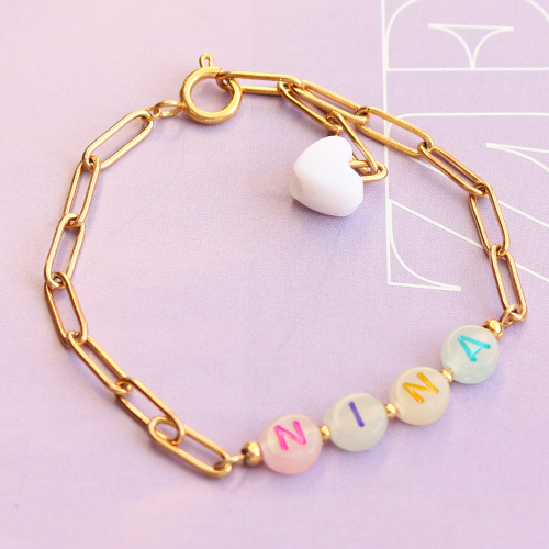 Ha llegado el momento de dar rienda suelta a tu creatividad y ponerte manos a la obra con las cuentas letras. Estas populares cuentas pueden combinarse de infinitas maneras. Esta vez decidimos crear pulseras. Por ejemplo, puede utilizar hilo elástico o macramé. Ambos materiales son perfectos para hacer estas pulseras. Para las pulseras hemos utilizado una mezcla de piedras naturales, cuentas de acero inoxidable, perlas de agua dulce y rocallas. De este modo, crearás un look vibrante, colorido y moderno. Los abalorios acrílicos letras también combinan perfectamente con las cuentas de acero inoxidable y la cadena Jasseron. Las cuentas del alfabeto se pueden ensartar junto con las cuentas doradas en bastón metálico para crear una entrepieza que se fije a la cadena Jasseron. Esta pulsera también es ideal para llevarla en conjunto con una pulsera bangle. ¡Buena suerte!