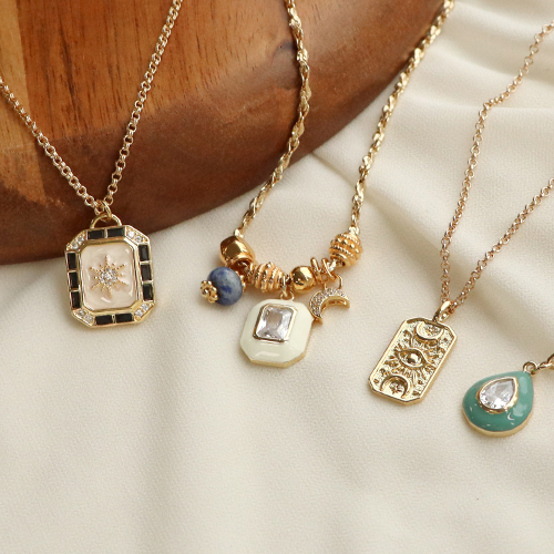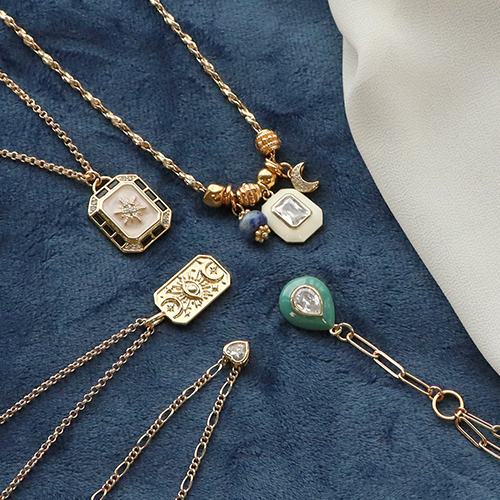 Estos colgantes y pendientes de latón con zirconia son perfectos para crear una colección de collares en capas. La tendencia es llevar varios collares de la misma longitud superpuestos. Crea collares con varios tipos de cadenas Jasseron para colocar colgantes. Lleva collares con distintos abalorios como Katsuki, cuentas facetadas, piedras naturales y cuentas Polaris.